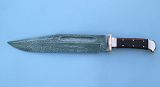 and Rosewood Stand $562.50 Nearly 2,000 years ago, steelsmiths in Damascus, Syria discovered that folded steel was far superior to the common homogeneous smelted steel which they had been working with. At the time, steelsmiths did not have the technology to create homogeneous steel so they had to combine steels and weld them together. The result created much more flexible yet tougher steel, which they used for knife blades. Known as "Steel of the Ancients," Damascus steel combines steels of different properties to produce a strong and malleable material. Creating this stunning form of steel is a difficult and risky process and has only a 75% success rate. After the steels are welded together, the surface is etched with an acid. Beginning with alternating layers of two types of steel, the materials are welded together in a coal forge. The layers of metal are then stacked and hammered into one piece. The material is then reheated and folded over and over again until the two original layers become 4, then 8, then 16, up to 512 layers. Once 512 layers are reached, the piece is cut, grinded and hammered into the knife blade. The metal is then hardended by heating and quenching. The blade is then placed in a 400 degree oven for two hours so it will temper. After tempering, the steel is sanded to a fine polish. Finally, the metal is soaked in a bath of acid to reveal the many beautiful swirling layers hidden underneath. This is a handsome authentic Damascus Steel Bowie Knife with Stand and Sheath. While other companies offer "Damascus" steel knives that are simply plain steel blades with an etched swirl pattern, ours are true handmade folded steel Damascus blades and no two are alike. The knife comes complete with a fine, hand sewn leather sheath and a beautiful solid rosewood display stand. If you have ever priced rosewood, you know that it is so expensive that it is sold by the inch rather than by the foot. A brass plaque can be mounted on the rosewood stand and can be custom engraved with up to 30 words in five lines of text and/or with a company logo. The Damascus Bowie's blade is made of carbon Damascus steel and is 0.27 inches (6.8 mm) thick and 1.8 inches (4.6 cm) wide. This knife measures 15 inches (38 cm) overall and weighs 1 pound 8.3 ounces (0.7 grams). The thick high quality top grain leather sheath weighs 3.1 ounces (88 grams). The solid rosewood stand measures 9 11/16 inches (24.6 cm) long and 3 inches wide (7.7 cm). The blade is shipped unsharpened but can easily be sharpened to a razor sharp edge. The Damascus Bowie Knife with Leather Sheath and Rosewood Stand sells for $562.50. We also offer a Marine Bowie Knife with Leather Sheath and two Damascus Pocket Knives. |