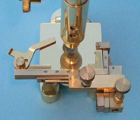 This beautiful solid brass microscope has a precision X-Y translation stage