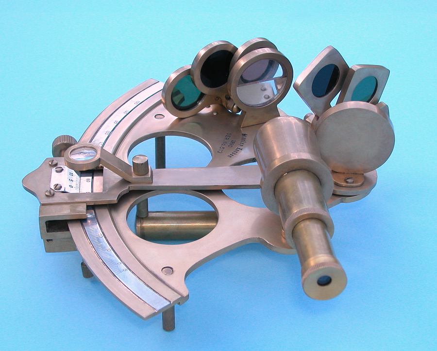 Serialized Antique Finish Brass Sextant with Hardwood Storage Case $185 The sextant comes with a beautiful felt-lined solid hardwood case with a solid brass plaque engraved "Stanley London." The case has two front clasps and a brass handle, and the corner joints are strengthened with beautiful inlaid hardwood splines. This hardwood case can be fitted with a custom brass plaque either on the outside of the case in place of the Stanley London plaque, on the front, or on the inside lid. The six-inch sextant is not a miniature sextant. The six-inch radius is a very common size in modern brass sextants. The sextant is 7 5/8 inches (19.4 cm) tall, 8 3/8 inches (21.3 cm) wide, and 3 3/8 inches (8.6 cm) deep. The sextant weighs 2 pounds, 6 ounces (1.08 kg), the felt lined hardwood case weighs an additional 2 pounds, 8 ounces (1.14 kg). While this sextant is fully functional, it does not come with a certificate of calibration and is not intended for navigation. We also offer a premium grade 6-inch radius sextant with leather case, a and premium grade 6.5-inch radius Polished Captain's Sextant with hardwood case. The 6-inch antique patina brass sextant with hardwood case sells for only $185. |
